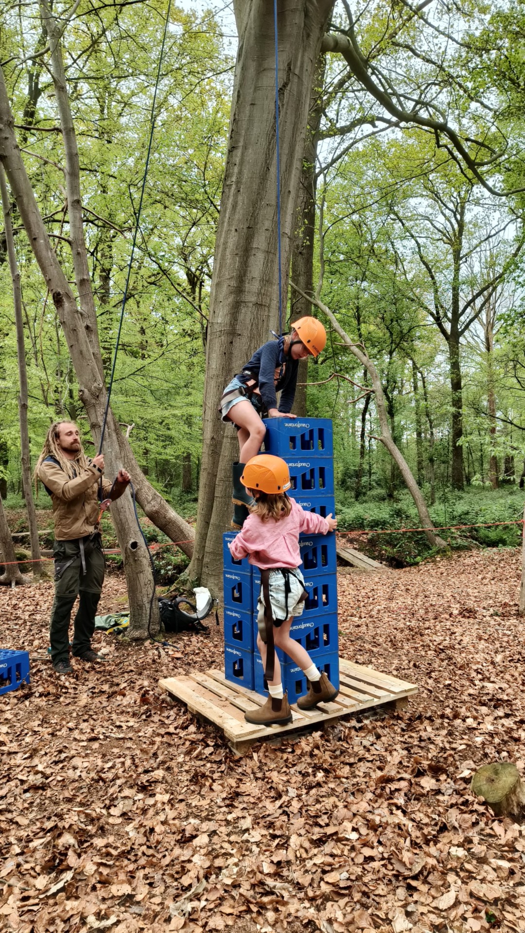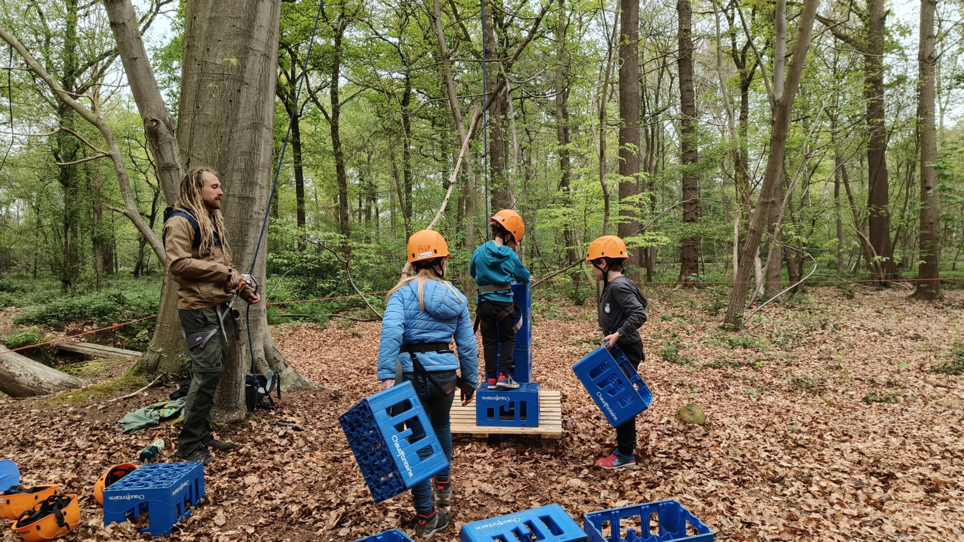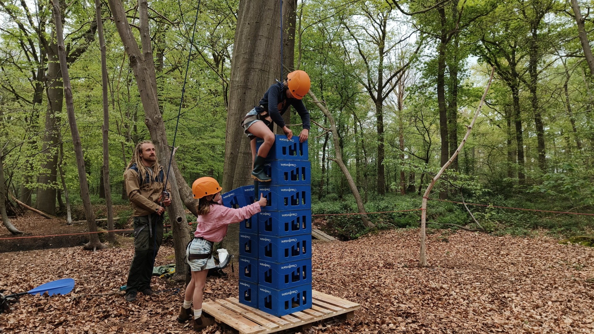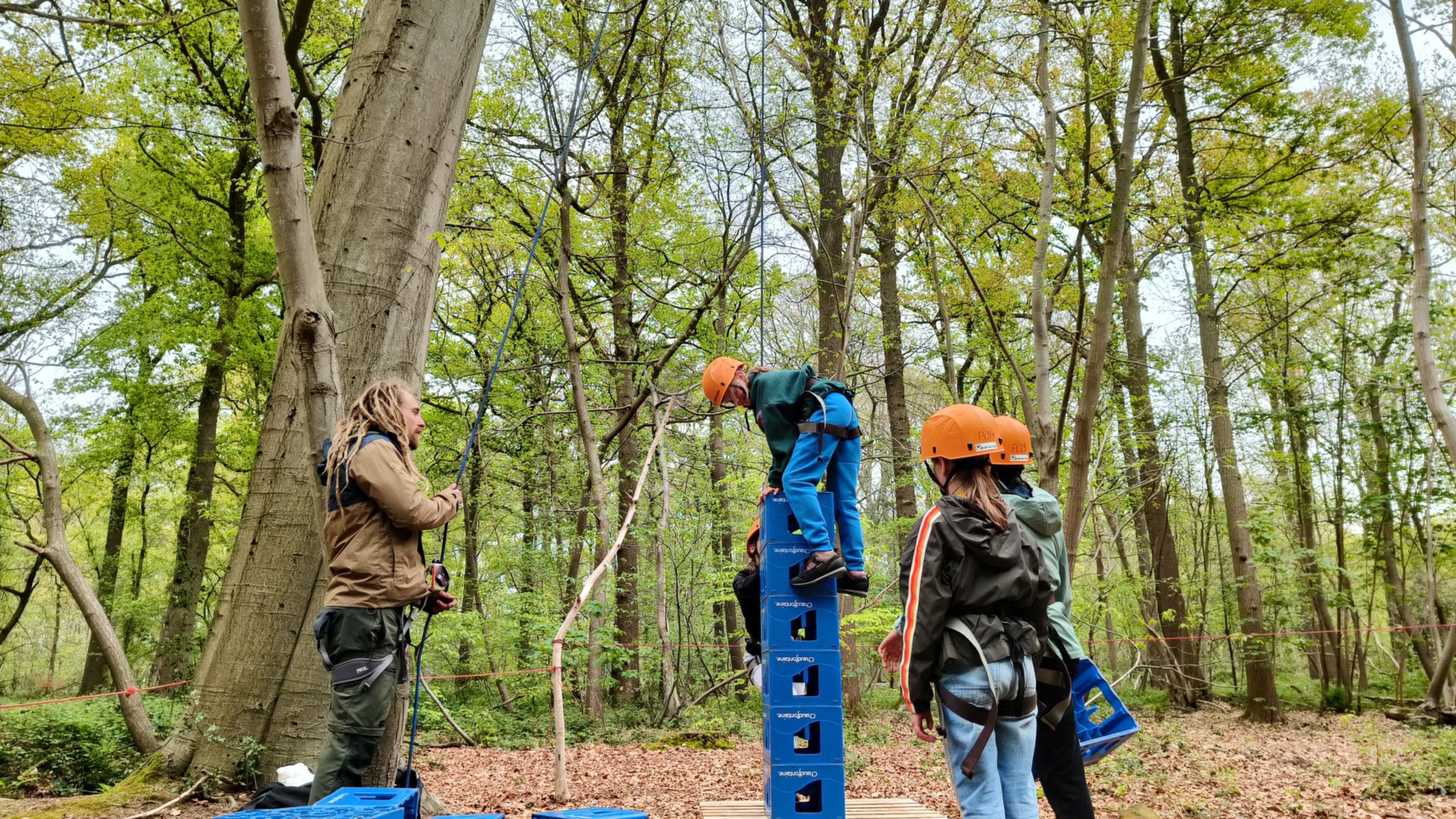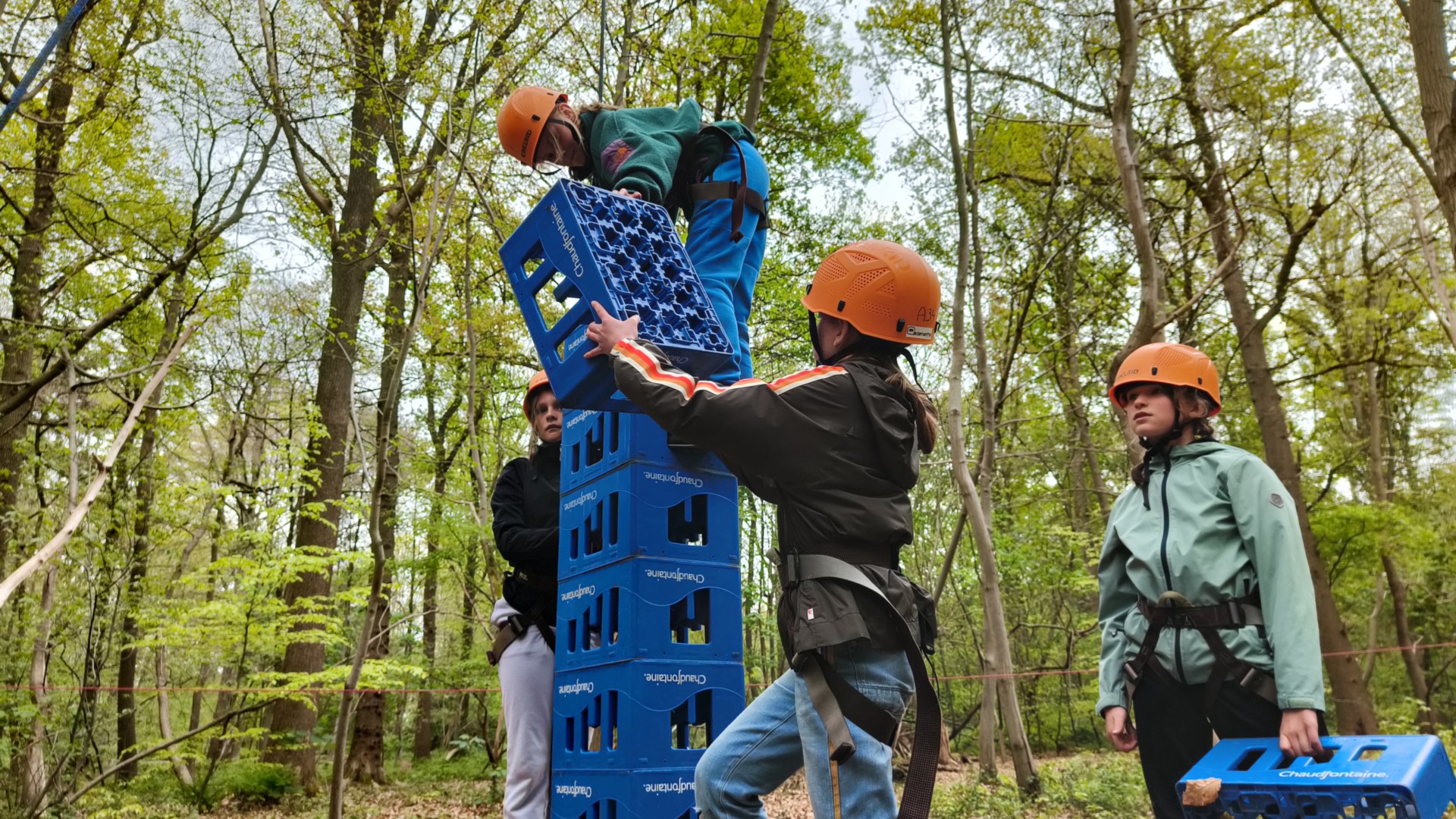 Eén teamlid staat bovenop de toren en wordt stevig beveiligd met klimmateriaal. Ondertussen stapelen jullie verder… tot de toren het begeeft – of jullie een record neerzetten! 😄