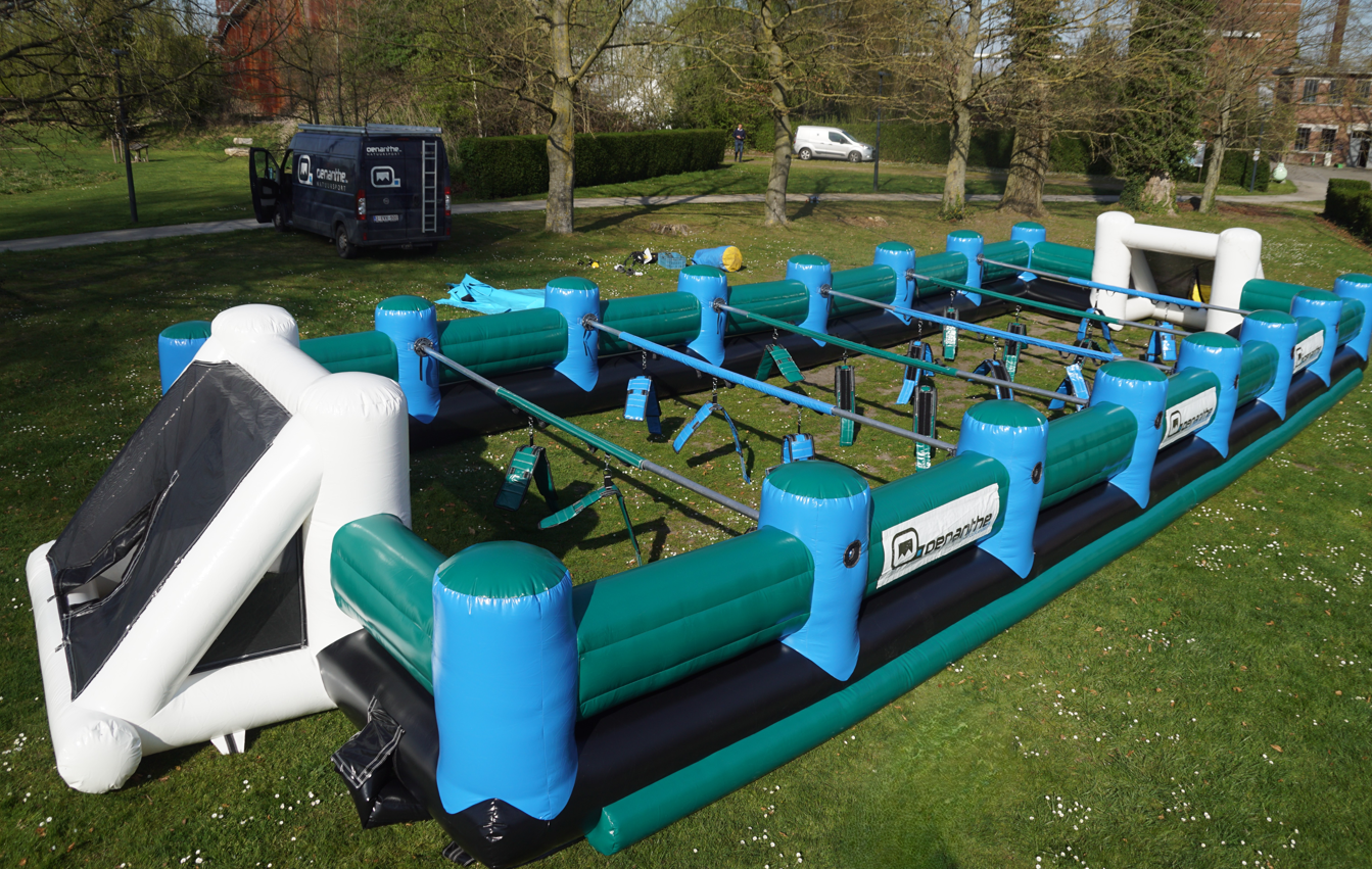 Je speelt met 8 tegen 8 op een opblaasbaar veld dat doet denken aan een gigantische kickertafel. 🎈👥👥