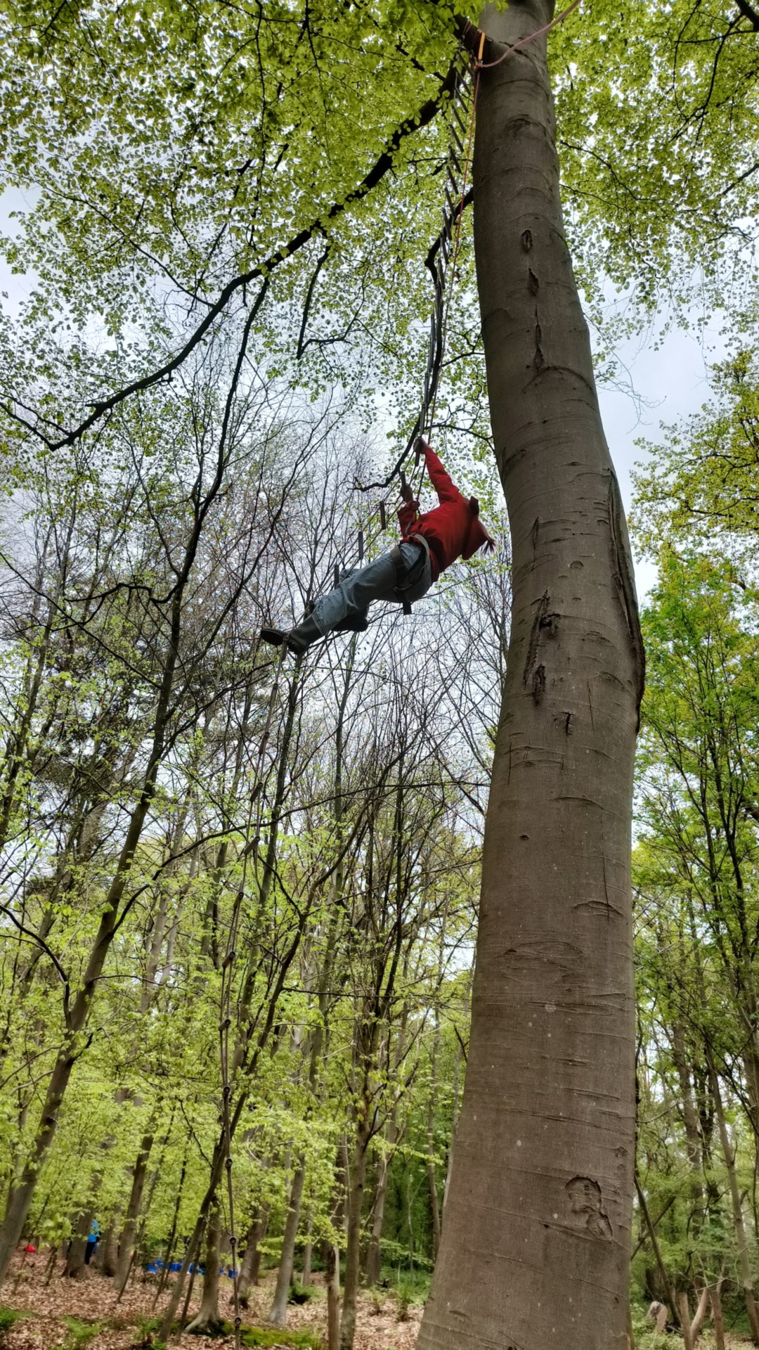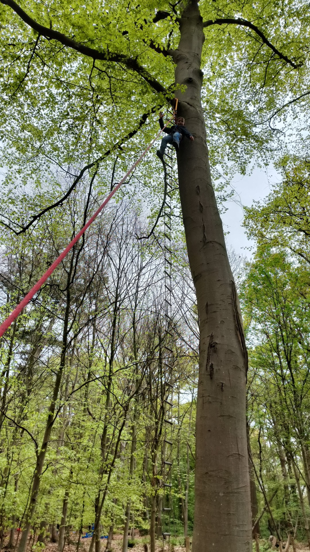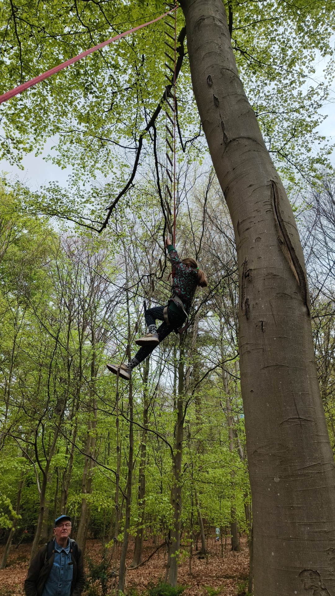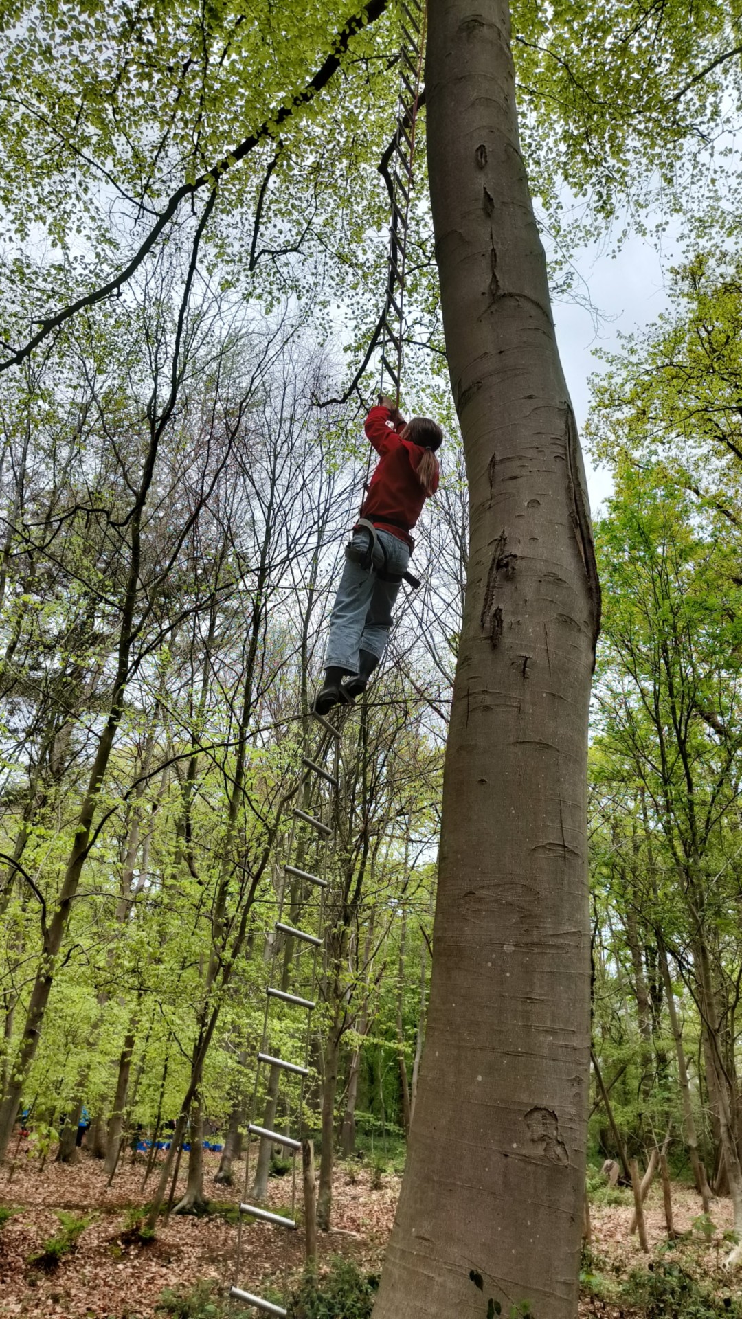 Eén voor één klimmen jullie omhoog langs de touwladder, terwijl je vertrouwt op je eigen kracht én het zekersysteem. Hoe hoog durf jij te gaan? 🌲